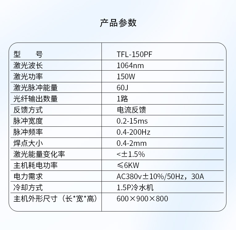 环球(中国)官方网站-登录入口激光TFL-150PF光纤激光焊接机,采用能量反馈控制模式,能量较稳定,光纤传输光束质量好,适合0.5mm以下金属不锈钢板材的精密激光焊接,是批量五金环球(中国)官方网站-登录入口中小功率焊接专用机型。