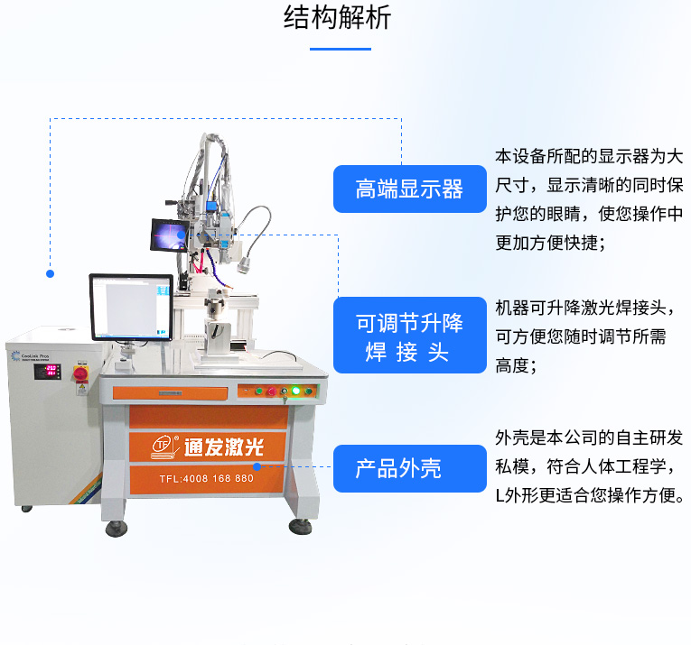 2、强大的PC控制,易于编程、调试和维护。可完成自动或半自动的点焊、对接焊、叠焊、密封焊,针对复杂的平面直线、圆弧及任意轨迹的焊接。