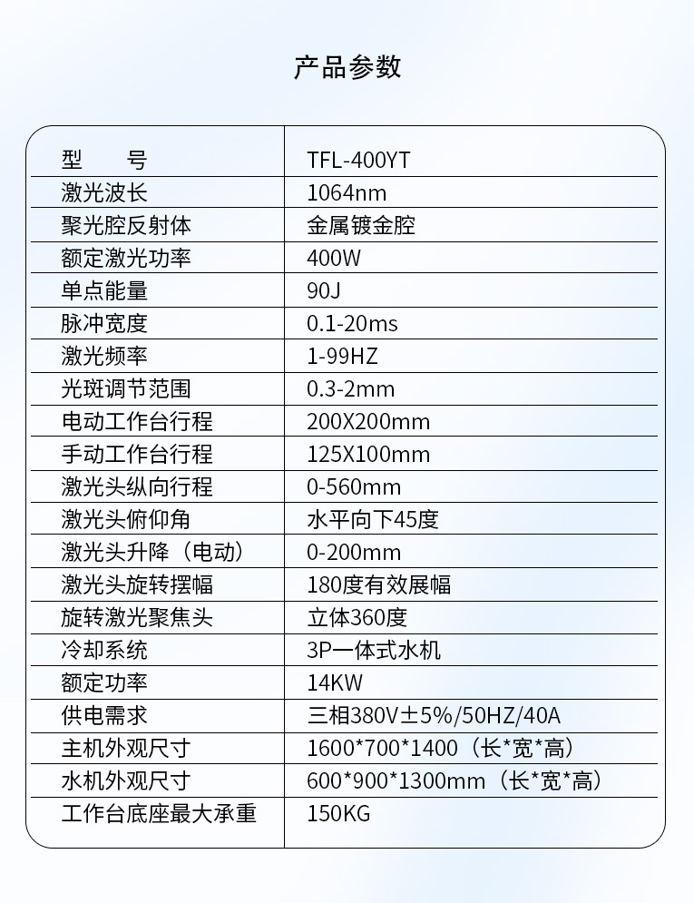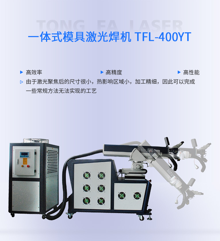 环球(中国)官方网站-登录入口激光一体式模具激光焊机TFL-400YT是一款多种功能融合一体的新型模具激光焊接机,针对特大型塑料模具激光焊、中型注塑模具激光烧焊、小型塑胶模具激光补焊、压铸模激光补焊具等各类模具可实现超精密修复,帮您解决大型汽车模具修复难题,不需要模具移动,电动工作台与立体旋转激光头完美结合,操作杆控制运动移动实现轻松激光修复大型模具,同时也保留了传统手动工作台超精密修复模具功能。