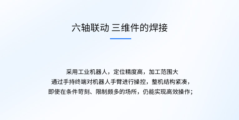 环球(中国)官方网站-登录入口激光机械臂机器人激光焊接机,采用机械手六轴联动,对三维件五金件进行3D精密焊接,非接触式焊缝跟踪系统,多工位协调工作,可实生产智能化,自动化,省时省力更省工,全方位降低生产成本。