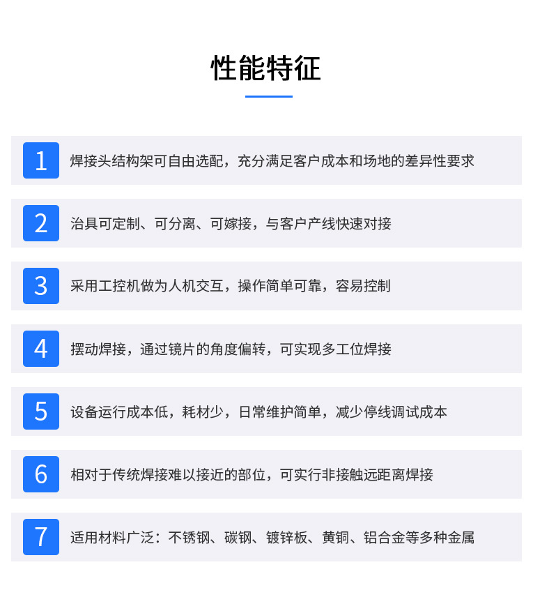 2、强大的PC控制,易于编程、调试和维护。可完成自动或半自动的点焊、对接焊、叠焊、密封焊,针对复杂的平面直线、圆弧及任意轨迹的焊接。